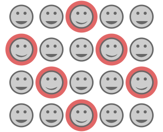 This features a large number of smiley faces arranged in a grid pattern. Each smiley face is highlighted with a red circle, giving the impression that they are being selected or chosen from a group. There are at least 13 visible smiley faces in the image, each varying slightly in size and position. The arrangement creates an interesting visual effect, as if the viewer is looking through a window of smiles.