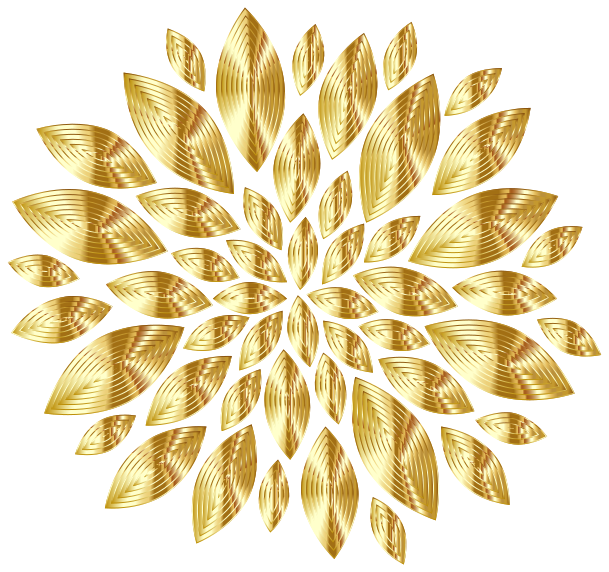 This features a beautifully designed gold flower with petals of varying sizes. The petals are arranged in an intricate pattern, creating a visually appealing and detailed design. The flower is composed of many individual petal shapes that come together to form the larger structure of the flower. This artistic representation showcases the artist's skill in crafting a captivating piece with gold accents.