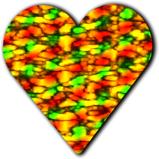 This features a heart-shaped object with an interesting and unique pattern. It appears to be made from a combination of different colors, including yellow, orange, red, green, blue, and purple. These colors are arranged in such a way that they create a visually appealing design on the heart's surface. The heart is positioned towards the center of the image, drawing attention to its vibrant pattern and striking appearance.