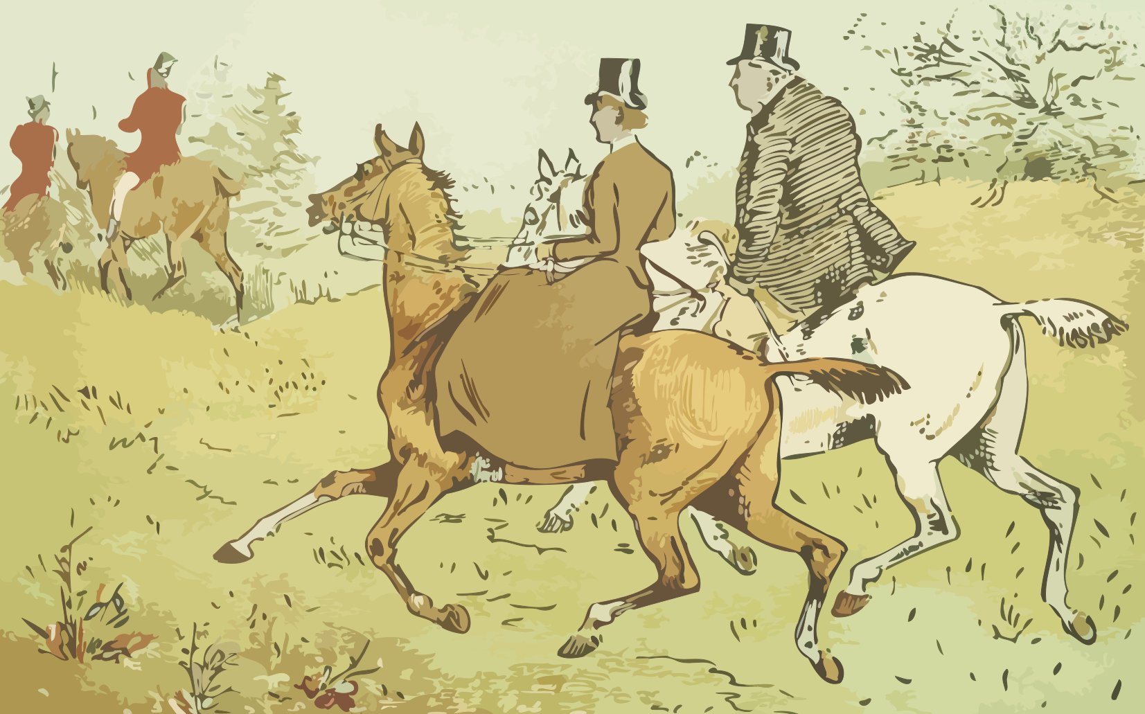 This depicts a group of four gentlemen riding horses in a field. They are all dressed in coats and hats, giving the scene an old-fashioned feel. Each gentleman is mounted on a horse, with one man riding a brown horse, another on a white horse, and two more men on brown horses. The horses appear to be running or galloping through the field, creating a sense of motion in the image. The gentlemen seem to be enjoying their time together as they ride across the grassy terrain.