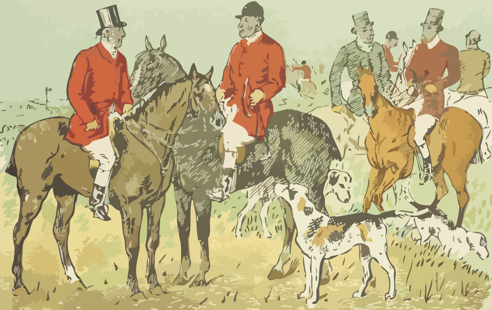 This depicts a group of men dressed in red coats, riding horses and accompanied by their dogs. There are several horses visible in the scene, with some positioned closer to the foreground while others are further back. The men appear to be gathered together, possibly preparing for an outdoor activity or event. In addition to the riders and horses, there is a dog standing near one of the horses, likely accompanying its owner on this adventure. The scene captures the camaraderie between the men and their dogs as they enjoy their time together in the field.