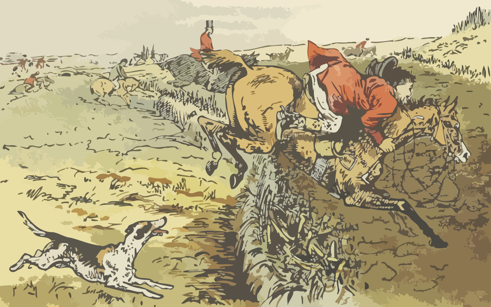 This depicts a man riding a horse, with the horse running fast through an open field. Behind them is a dog, likely accompanying the hunter on his ride. The scene captures the excitement and energy of both the man and the horse as they traverse the landscape together.