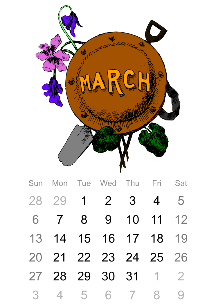 This features a calendar with the month of March written on it. The calendar is decorated with a pot and purple flowers, giving it an artistic touch. There are several dates visible on the calendar, including the 29th, 30th, and 31st of March. Additionally, there are two spoons hanging from the pot, adding to the overall charm of the design. The combination of the pot, flowers, and spoons creates a visually appealing and unique calendar for the month of March.