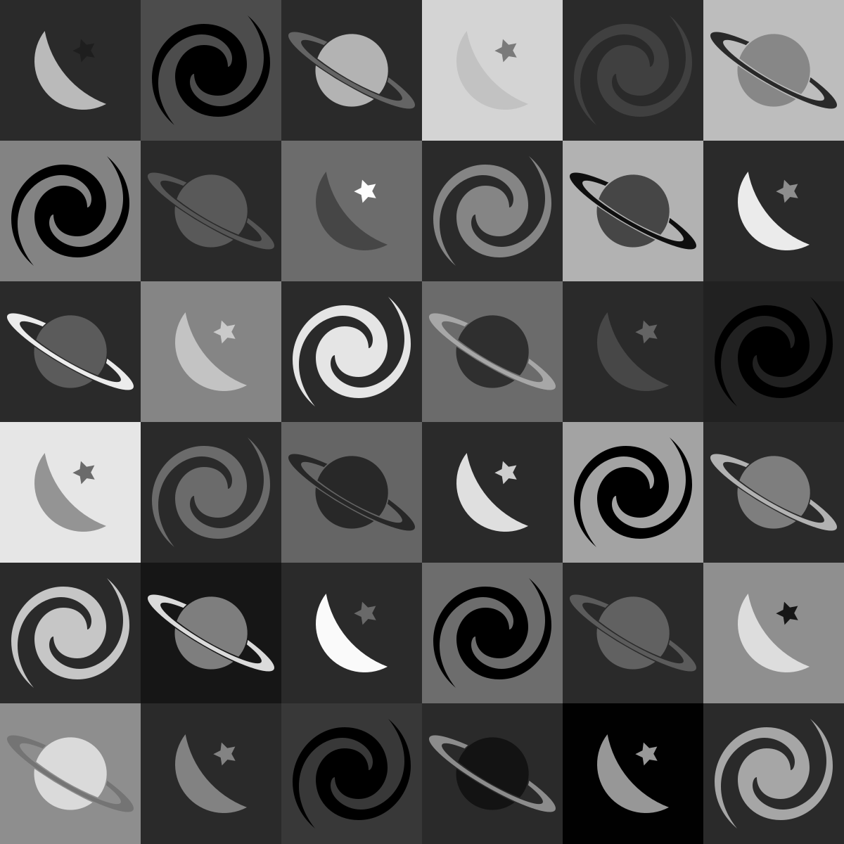 This is a black and white pattern featuring various celestial objects. There are twelve different images of planets, moons, and stars arranged in a grid-like formation. Each object has a unique shape and size, with some appearing larger than others. The arrangement creates an interesting visual effect that showcases the diversity of these celestial bodies.