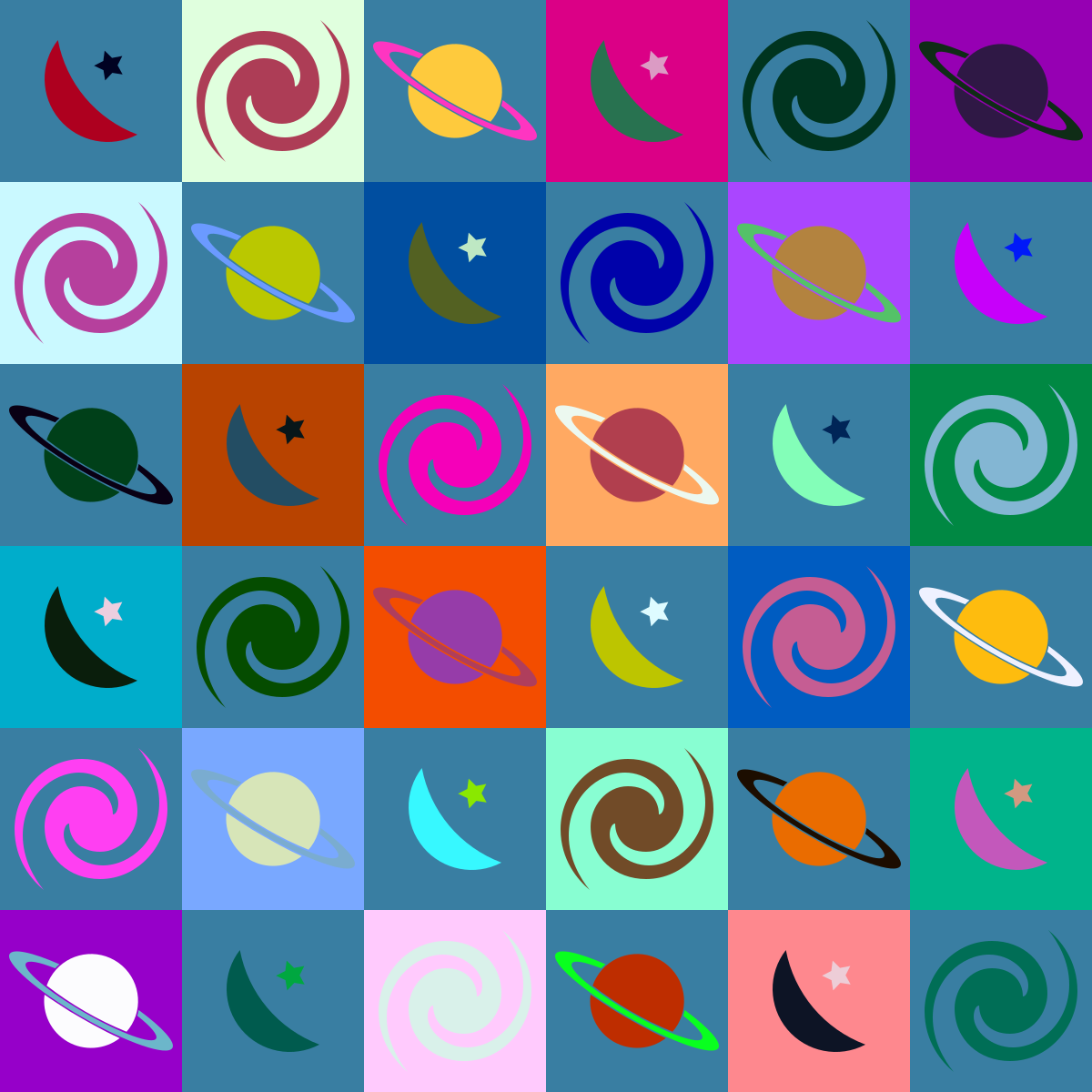 This is a colorful pattern featuring various celestial objects. There are multiple planets and stars displayed in the design, with some being darker in color while others are lighter. The pattern showcases an array of different colors, creating a visually appealing display. The celestial objects include planets such as Saturn and Jupiter, along with other space-related elements like moons and stars. Overall, the image presents a vibrant and diverse collection of celestial bodies that are sure to captivate viewers.