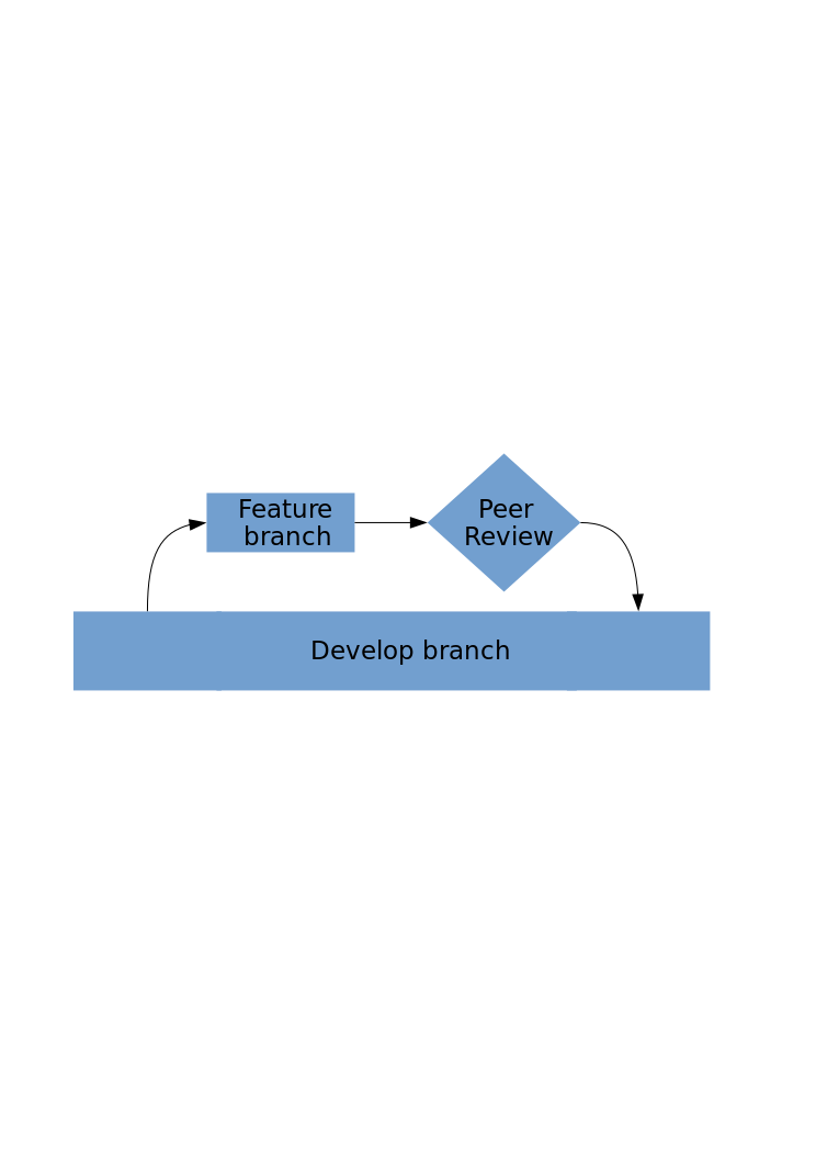 This displays a diagram that illustrates the process of collaboration in software development. It shows how developers can work together to create and review code, with a focus on branching and merging. There are several arrows pointing towards different elements within the diagram, indicating connections between them. The main components of this diagram include "Develop Branch," "Peer Review," and "Merge." The "Develop Branch" section shows how developers can create new branches for their work, while the "Peer Review" section highlights the importance of reviewing each other's code to ensure quality and efficiency. Finally, the "Merge" component demonstrates how these branches can be combined into a single codebase through a seamless merging process. Overall, this diagram provides an overview of the collaboration process in software development, emphasizing the importance of teamwork and communication.