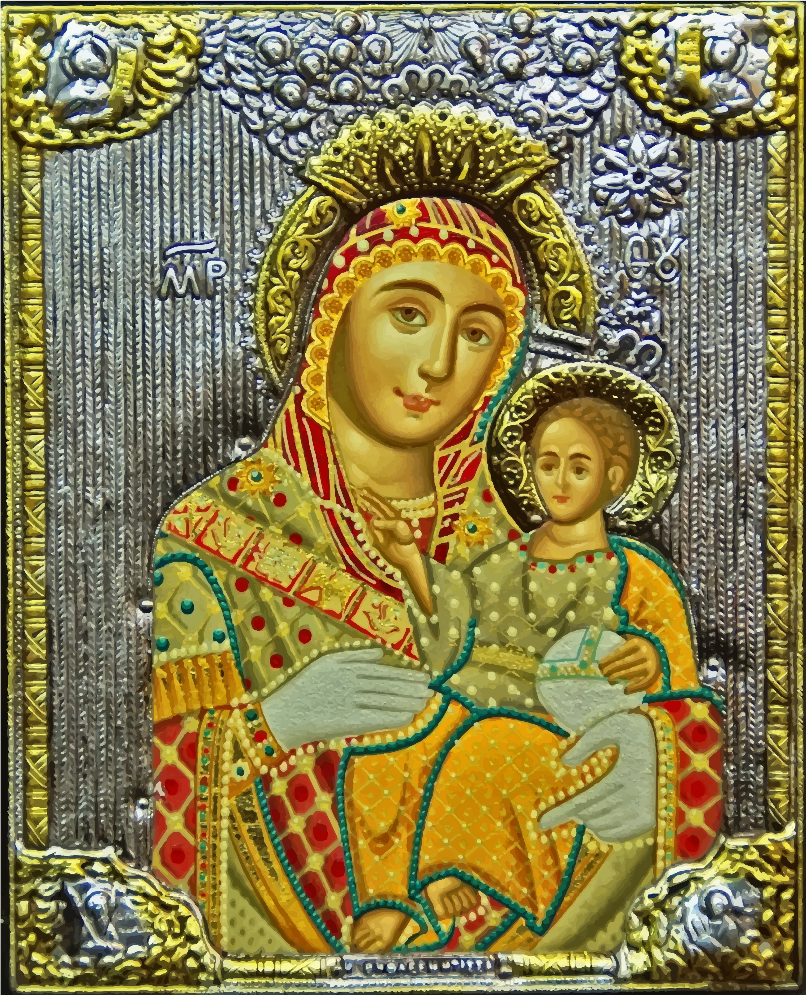 This features a beautifully crafted artwork of Mary, the mother of Jesus, holding her child. She is wearing a golden robe and has a serene expression on her face as she gazes at her baby. The baby appears to be a young boy, dressed in a similar manner to his mother. The image captures the tender bond between the two figures, showcasing their love and devotion for each other.