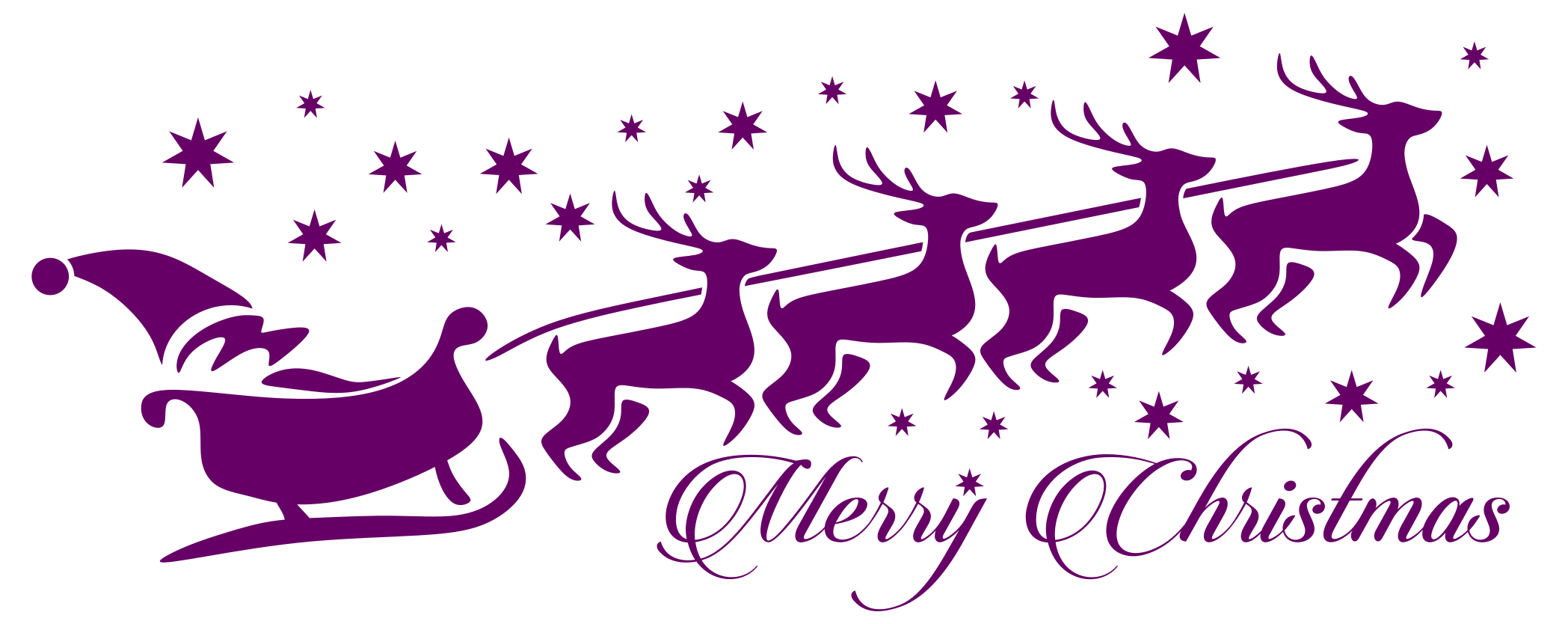 This features a festive scene of reindeer and Santa Claus flying through the sky. There are six reindeer in total, with some positioned closer to the top left corner while others are scattered throughout the middle and right side of the image. They all have their silhouettes painted purple, adding a unique touch to the holiday scene. In addition to the reindeer, Santa Claus is also present in the picture, flying alongside them. He can be seen towards the top left corner of the image, with his distinctive red and white attire making him stand out against the purple background. The combination of these elements creates a visually appealing and joyful holiday scene.