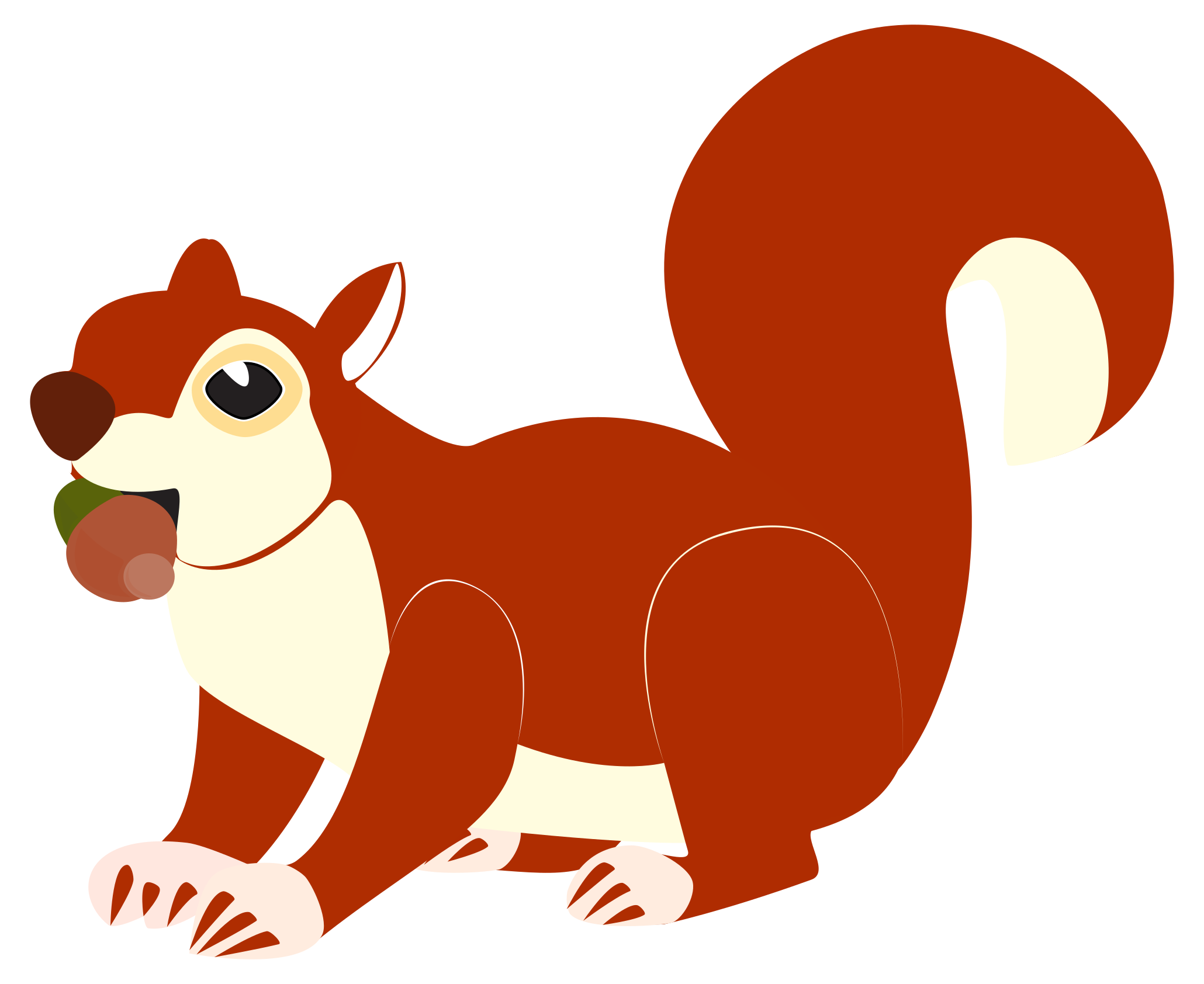 This features a colorful squirrel drawing with a nut in its mouth. It is depicted from the side, showcasing its white and red fur. The squirrel appears to be standing on one leg while holding the nut in its mouth, giving it an adorable appearance. This delightful illustration captures the essence of a typical squirrel scene with a playful twist.