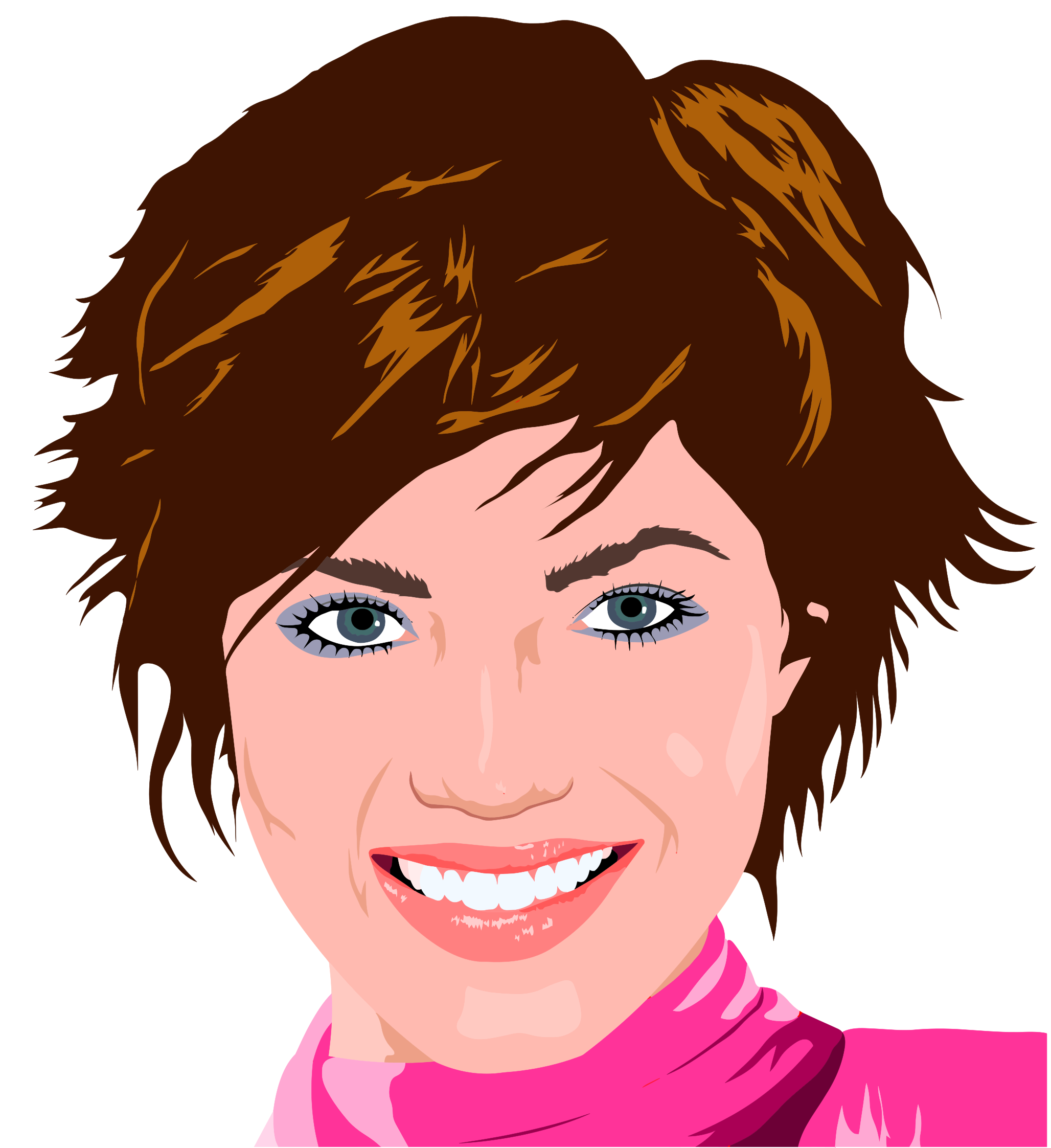 This features a woman with short brown hair, wearing a pink scarf. She is smiling and has her mouth open, showing off her teeth. Her eyes are bright blue, adding to the overall charm of the picture. The woman appears to be in a happy mood as she poses for the camera.