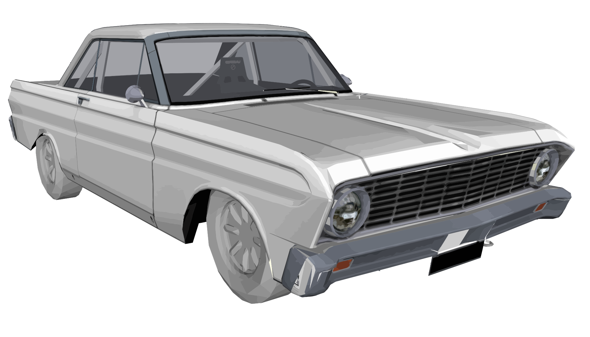 This features a gray car parked in a parking lot. It is an old model, possibly a Ford Falcon, and it has two headlights on the front. The car appears to be empty, with no driver visible inside. The scene is set against a white background, which provides a clean and uncluttered look for the image.