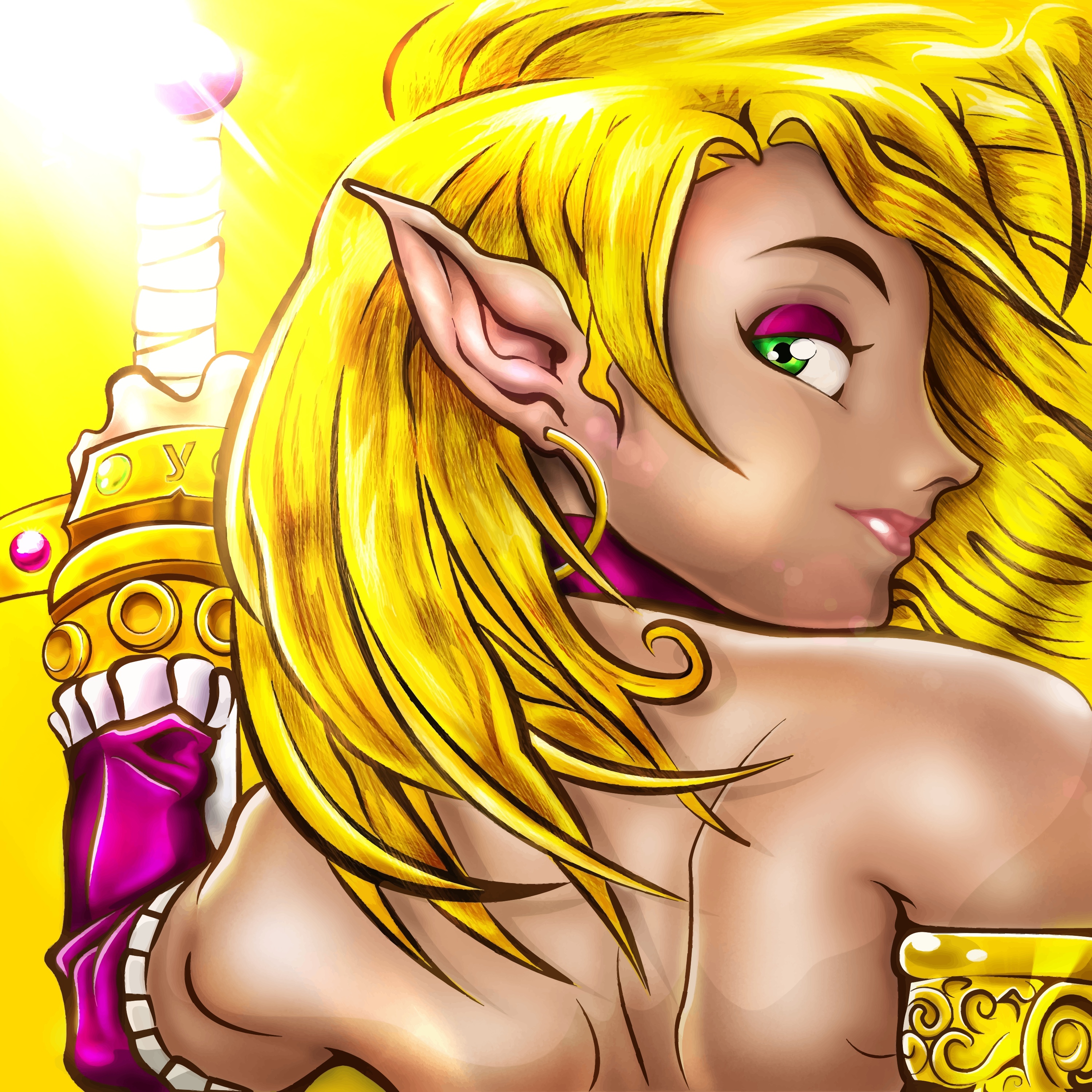 This features a beautiful woman with long blonde hair, wearing a gold and purple dress. She is posing for the camera while holding a sword in her hand. Her outfit appears to be inspired by fantasy or medieval times, adding an element of mystique to the scene. The woman's facial expression suggests that she might be playful or even slightly mischievous. The overall atmosphere of the image is one of elegance and adventure, with a hint of whimsy.