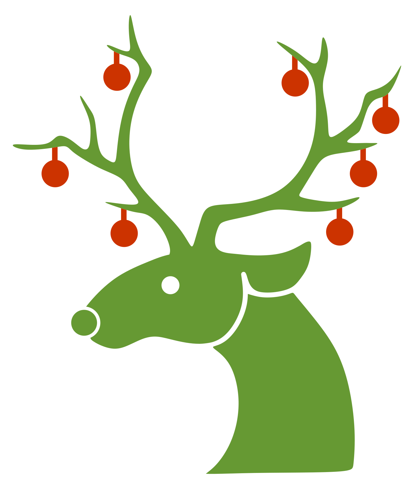 This features a green deer with antlers adorned with red ornaments. The deer's head is prominently displayed, and its antlers are decorated with multiple red berries or cherries. This unique design gives the impression of a Christmas tree made from antlers and berries. The overall appearance of the image is festive and eye-catching, making it an interesting and creative representation of a deer's head during the holiday season.