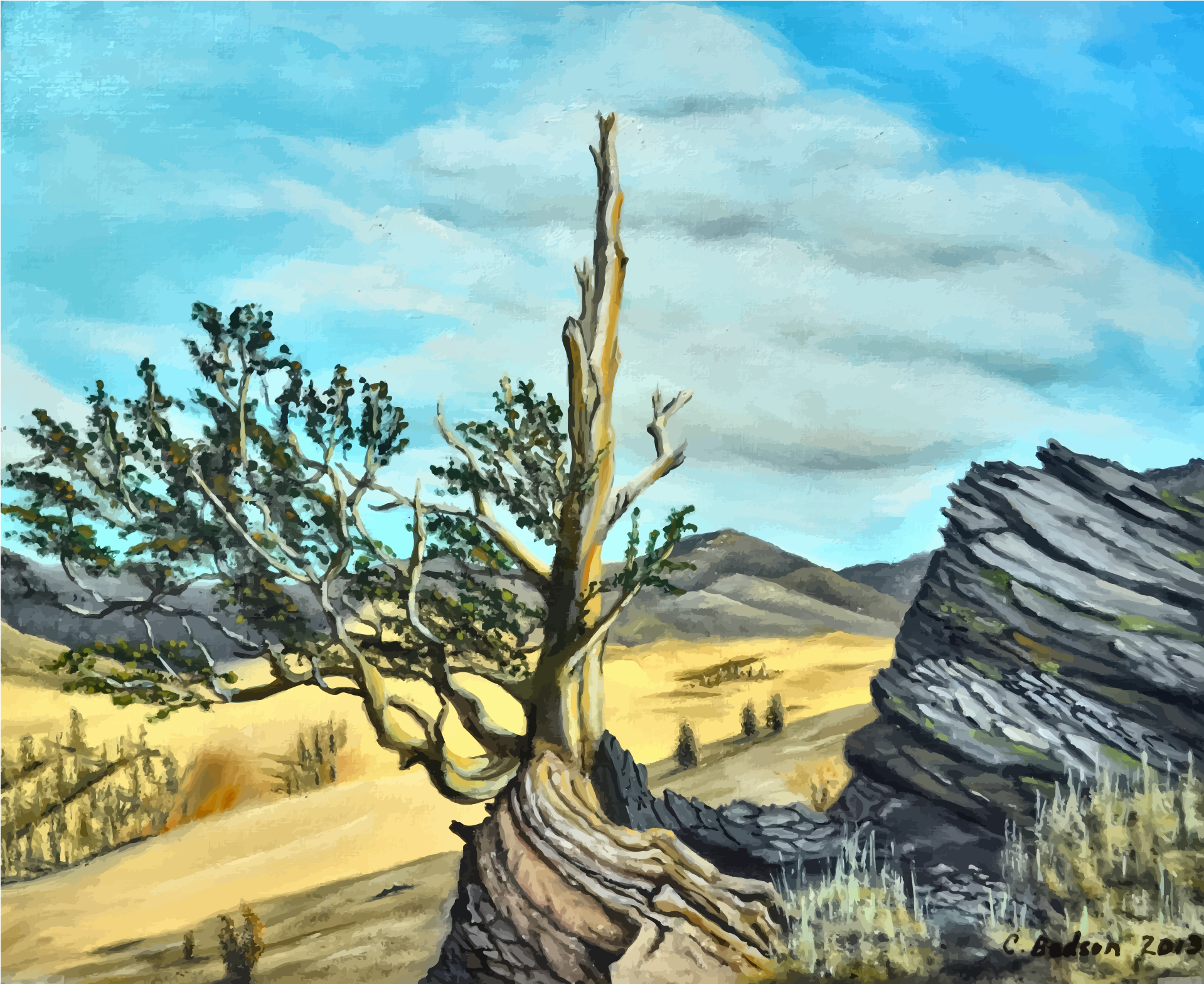 This features a tree with a large, gnarled trunk and branches. It is situated in an open field with a rocky landscape in the background. The sky above the scene appears to be cloudy, adding depth and atmosphere to the painting. In addition to the main tree, there are several other trees scattered throughout the field, creating a sense of vastness and natural beauty.