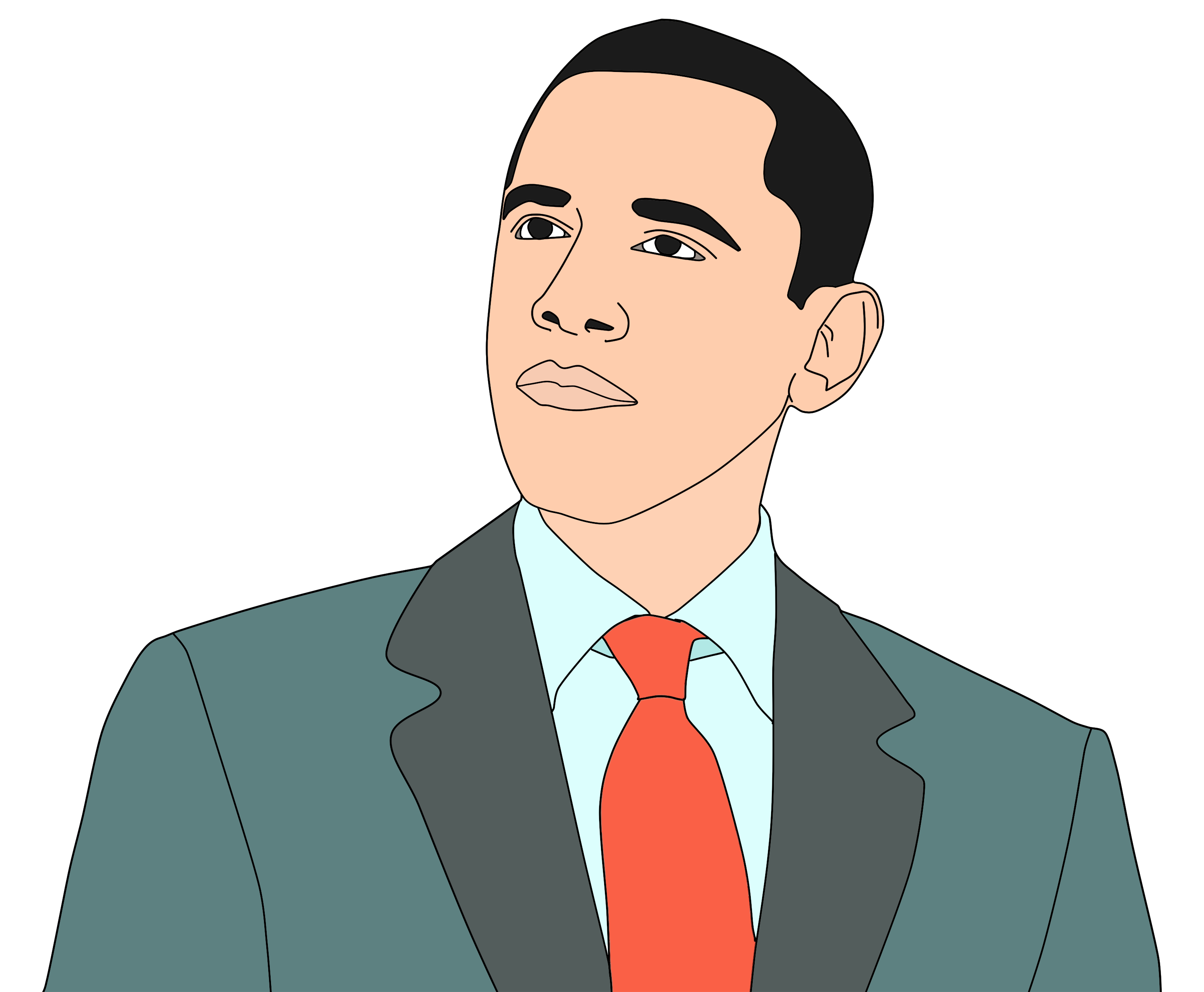 This features a colorful drawing of President Obama, who is wearing a suit and tie. He has an orange tie that stands out against his attire. The drawing captures the president's facial expression as he looks directly at the viewer. The overall composition of the image gives it a vibrant and engaging appearance.