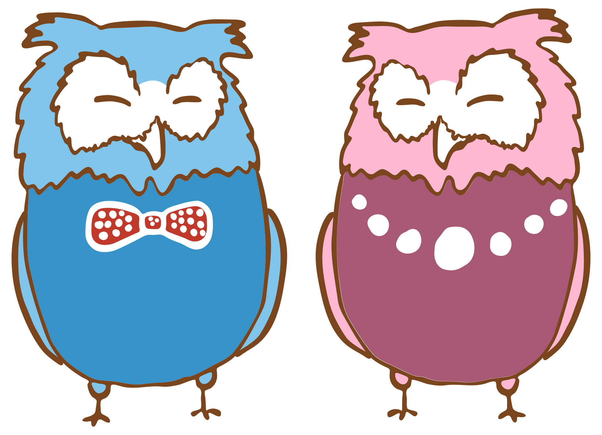 This features two cartoon owls, each wearing a bow tie. One of the owls is blue and has a red bow tie on, while the other one is pink with a white bow tie. They are standing next to each other, creating an adorable scene. Both owls have big eyes, which adds to their cute appearance. The image appears to be a colorful illustration of these two charming characters.