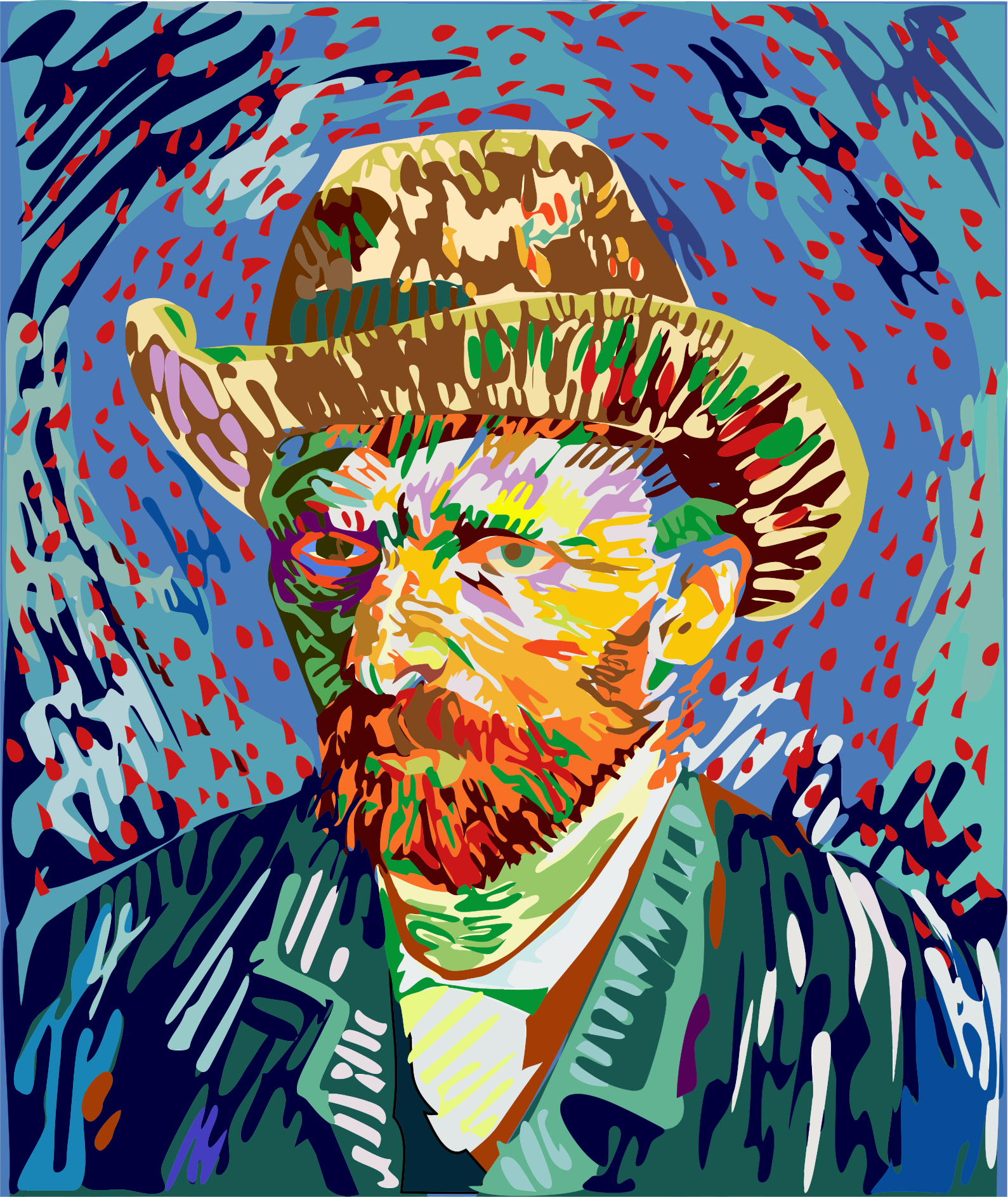 This is a painting of a man wearing a hat, which appears to be a straw cowboy hat. He has a beard and seems to be looking at the viewer with an intense expression. The painting is colorful and features various shades of green, red, blue, yellow, and orange. The man's face takes up most of the image, capturing his attention as the main subject.