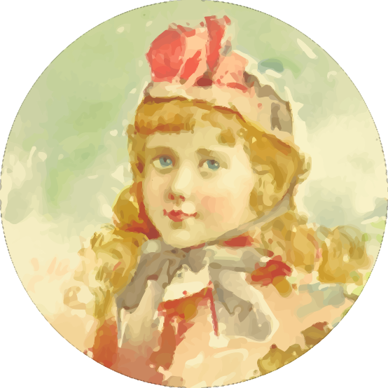 This features a young girl wearing a hat and a red bow. She is looking directly at the camera, with her eyes wide open. Her hair is styled in braids, adding to her adorable appearance. The girl's outfit includes a dress that complements her overall look. The scene appears to be a painting or drawing, giving it an artistic and charming quality.