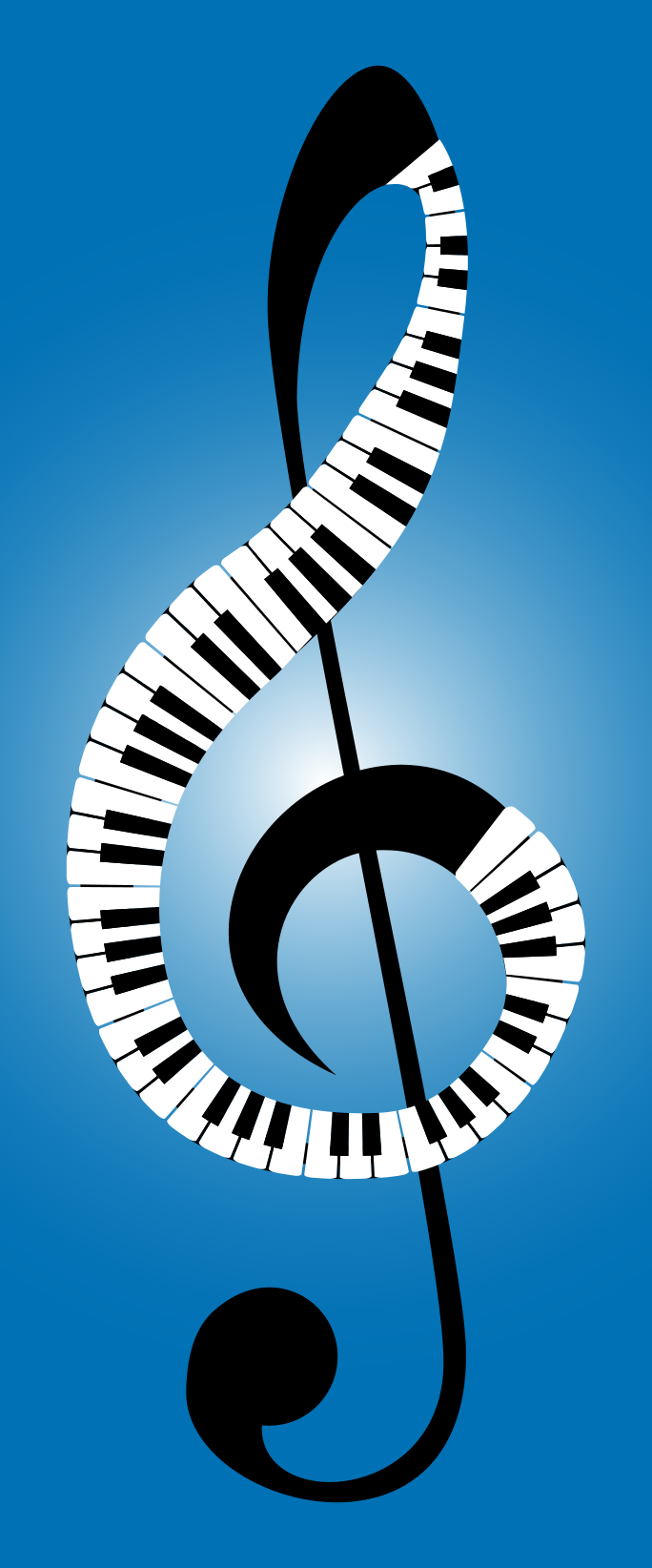 This features a blue background with a black and white piano key design. The keys are arranged in such a way that they form the shape of a musical note, creating an interesting visual effect. This unique representation of music adds a creative touch to the overall composition.