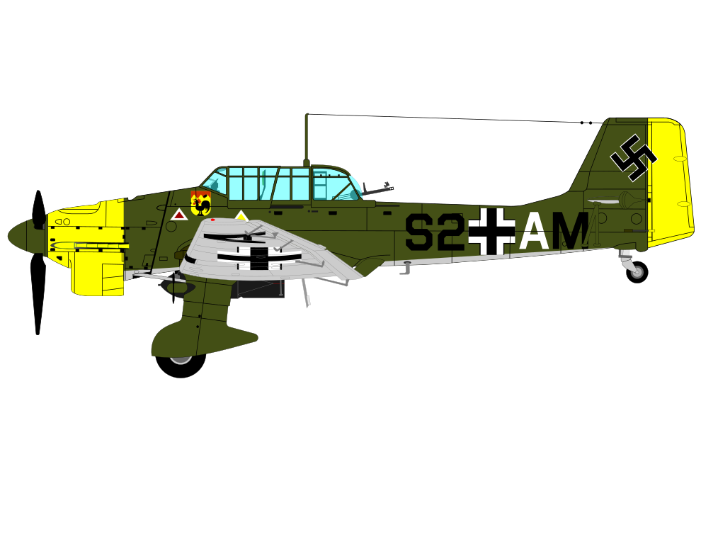 This features a large, dark green propeller plane with the letters S2A on its side. It has two engines and is ready for takeoff. The plane's tail displays a swastika symbol, which indicates that it may have been used by the Nazis during World War II. The plane appears to be in good condition and is likely an old military aircraft.