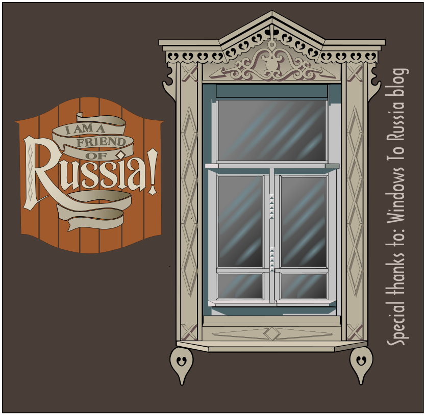 This features a large window with a wooden frame, which is adorned with the words "Russia!" written on it. The window has a glass covering and appears to be made in a Russian style. Next to the windows, there is a wooden sign that reads "I am friend of Russia!". This unique design element adds an interesting touch to the overall appearance of the scene.