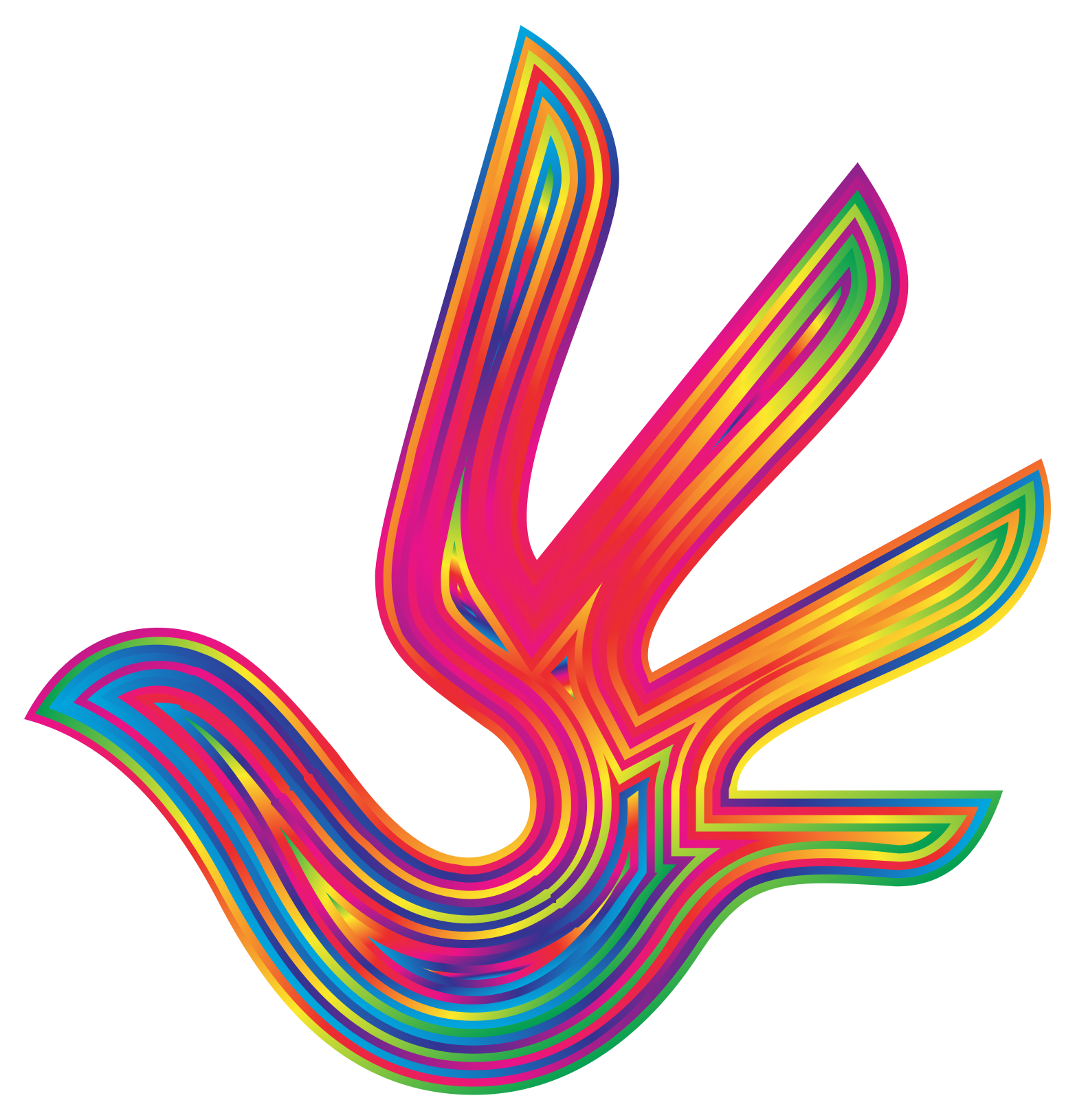 This features a vibrant and colorful dove, which is shaped like a handprint. This unique design gives the dove an interesting and eye-catching appearance. The colors used in this artwork are predominantly pink, orange, yellow, green, blue, and purple, creating a visually striking scene. The dove's wingspan spans across most of the image, showcasing its impressive size and detail. Overall, it is an intriguing piece of art that captures attention with its vivid colors and creative design.