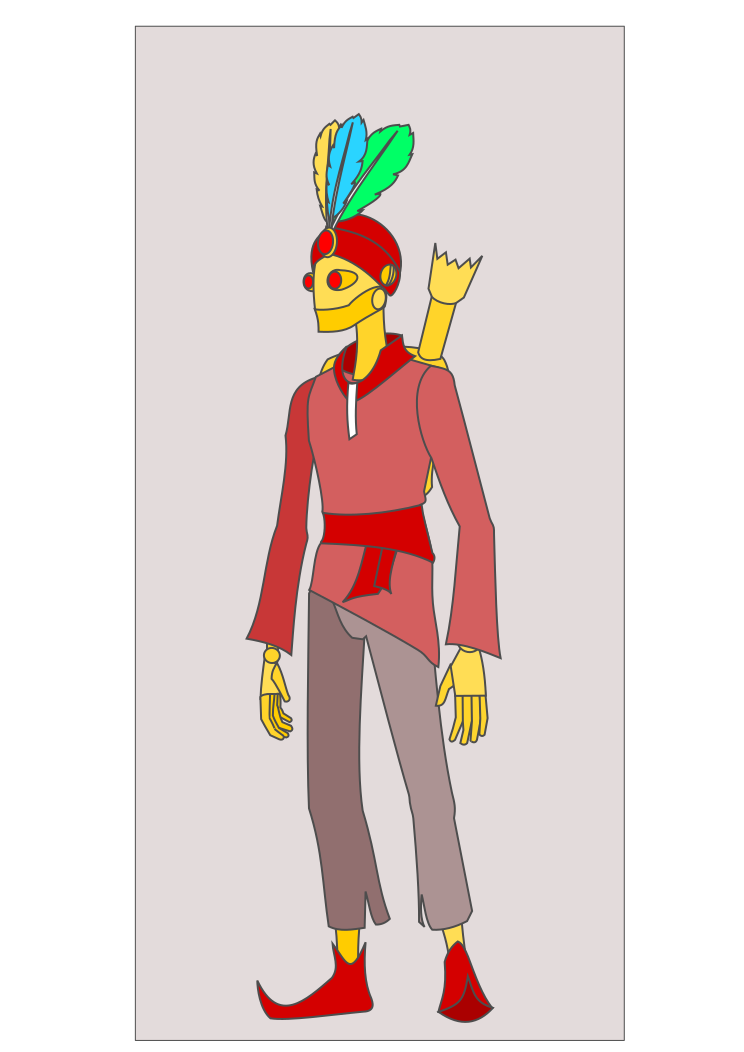 This features a cartoon-like robot dressed in red clothing, with a yellow head and blue eyes. It is wearing a red shirt and gray pants, giving it an interesting appearance. The robot's outfit includes a bow tie, adding to its unique style. In addition to the main character, there are two arrows pointing upwards on either side of the robot, possibly indicating directions or points of interest. Overall, this image showcases a creative and imaginative representation of a robot in a colorful outfit.