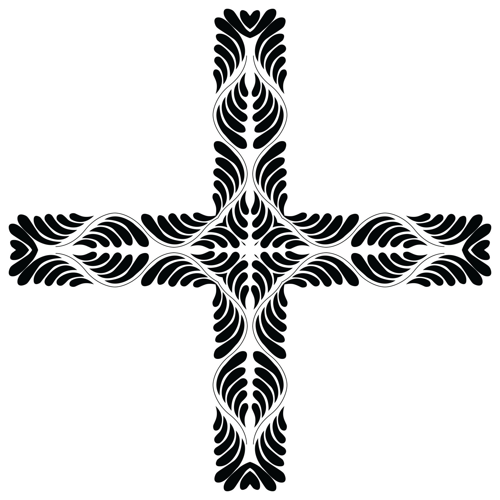 This features a cross with an intricate design, showcasing a combination of black and white elements. The cross is adorned with a pattern that includes leaves and other decorative shapes, creating a visually appealing and artistic representation. The contrast between the black and white colors adds depth to the design, making it stand out against its background. This unique cross design can be appreciated for both its aesthetic appeal and symbolic meaning.