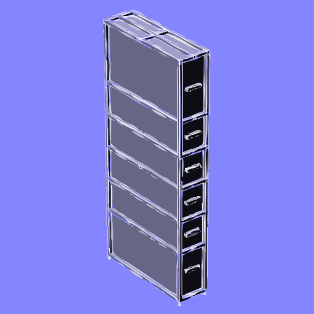 This features a three-tiered storage unit made of metal. It is designed with multiple shelves, providing ample space for storing various items. The storage unit appears to be made from aluminum and welded together, giving it a sturdy and durable appearance. The design of the storage unit suggests that it was created using an open-source modeling software called OpenSCAD, which is known for its ability to create complex 3D models with ease. However, there may be room for improvement in terms of converting the code into a more refined vector format for better visual representation.