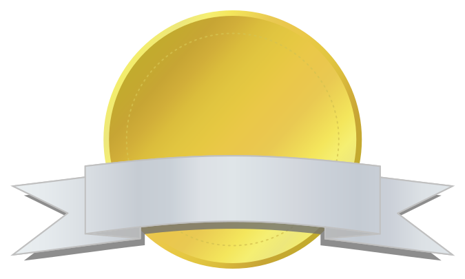 This features a gold coin with a silver banner around it. The banner has a white border and is adorned with two small blue ribbons on either side, giving the impression of an award or recognition. The gold coin itself appears to be a medal, possibly representing achievement or accomplishment in some field. The overall composition of the image gives off a sense of prestige and honor.