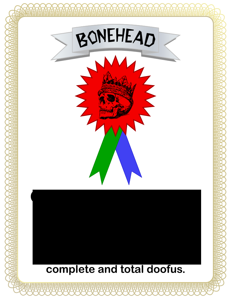 Tags: award, certificate, joke, satirical, satire, certificate bonehead