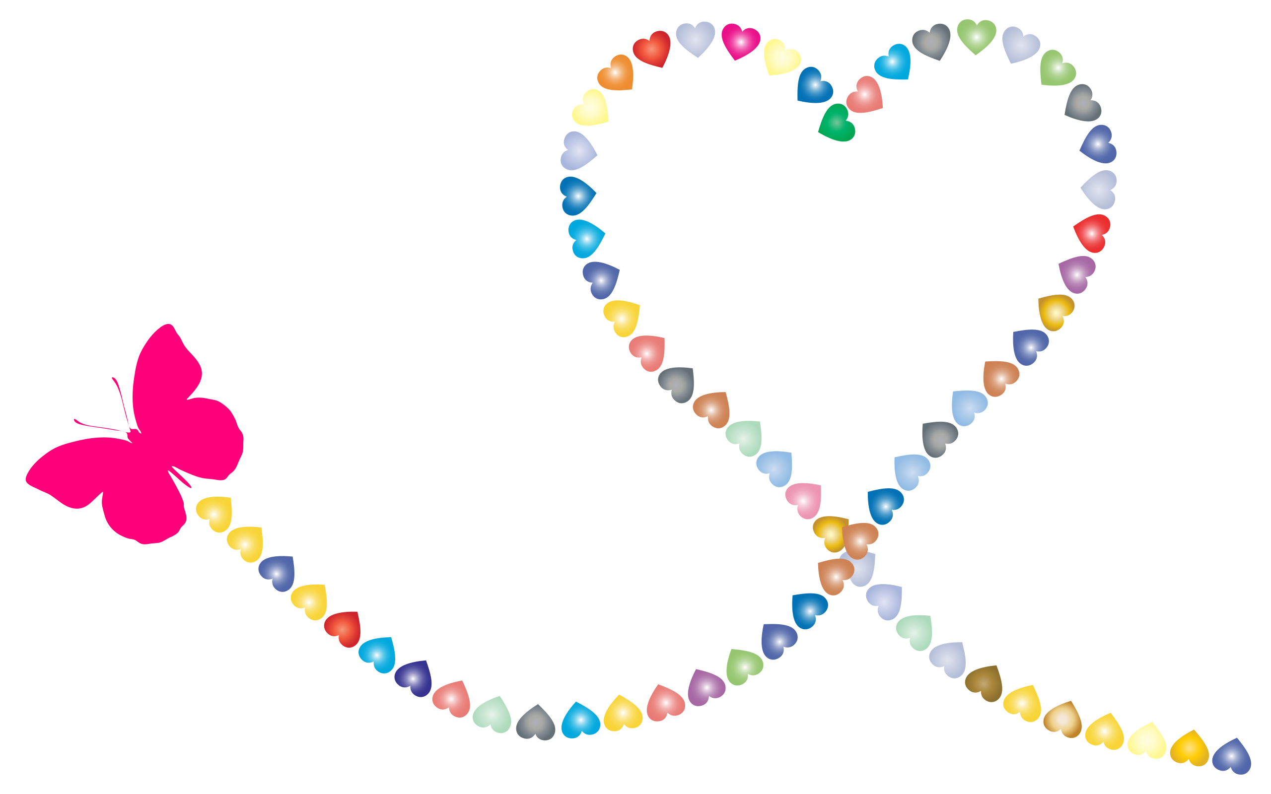 This features a pink butterfly flying across the screen, leaving behind it a trail of colorful hearts. These hearts form a heart shape on the right side of the picture, creating an eye-catching and playful scene. The butterfly is positioned towards the left side of the image, while the hearts are scattered throughout the rest of the frame, adding depth and visual interest to the overall composition.
