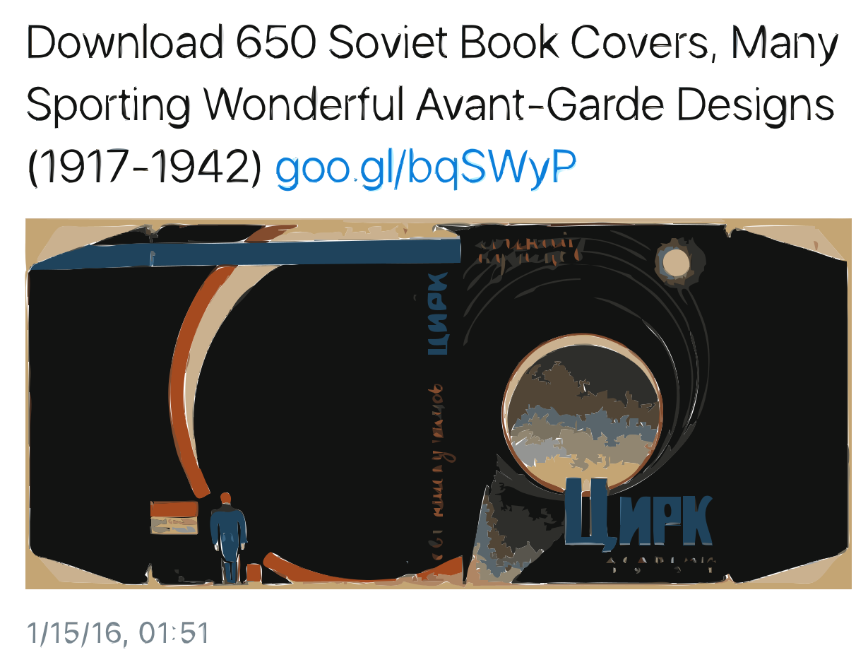This features a man standing in front of a large black wall, which is an illustration. Above the picture, there is text that reads "Download 650 Soviet Book Covers, Many Sporting Wonderful Avant-Garde Designs (1917-1942) goo.gl/bqSWyP". The image appears to be a part of an advertisement or promotion for the book covers.