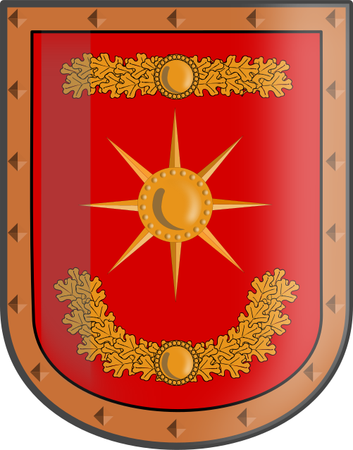 This features a red shield with a yellow sun in the middle, giving it an old-fashioned appearance. The shield is adorned with a brown frame and has a curved bottom. The design of the shield resembles that of a coat of arms, making it a unique and eye-catching piece.