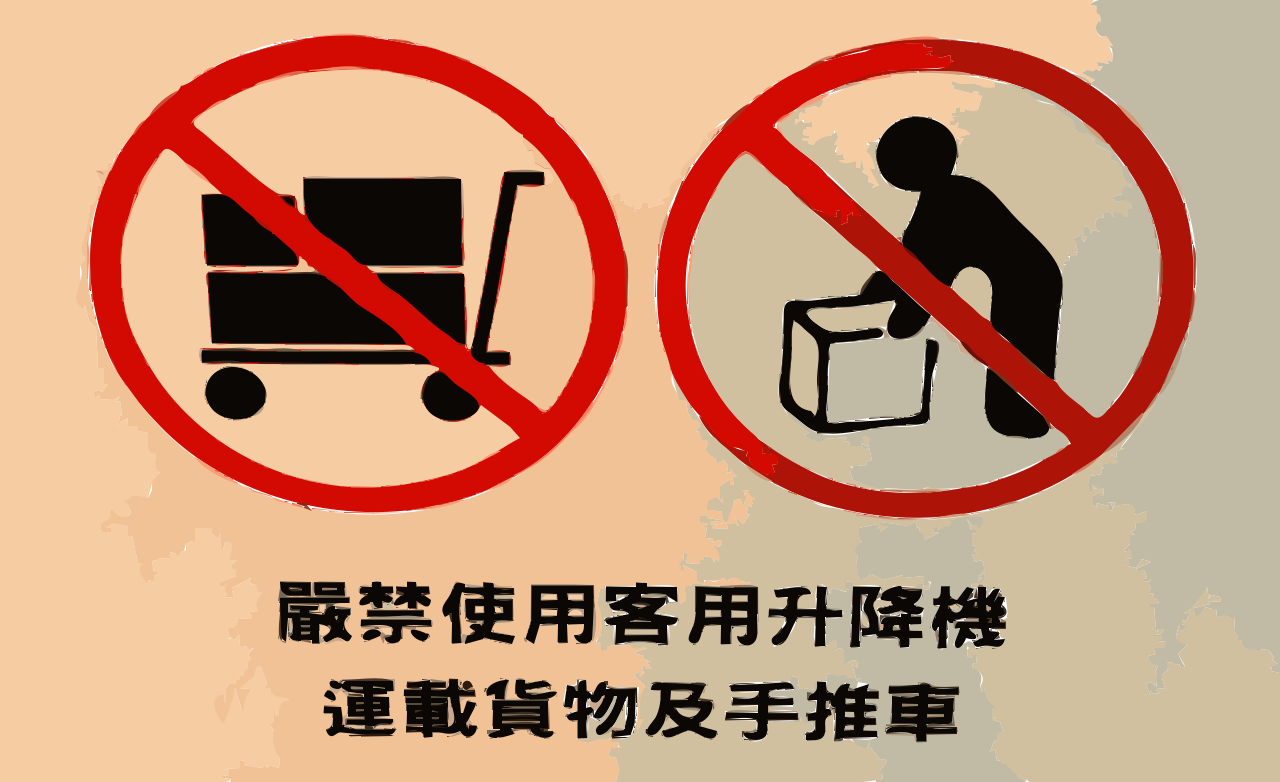 This features a sign with two red and black symbols, one of which is a man holding a box. The other symbol is a cart or dolly. The sign indicates that the area is restricted or prohibited for certain activities, such as delivering items in boxes or using carts. The signs are written in an Asian language, suggesting that they may be located in an Asian country.