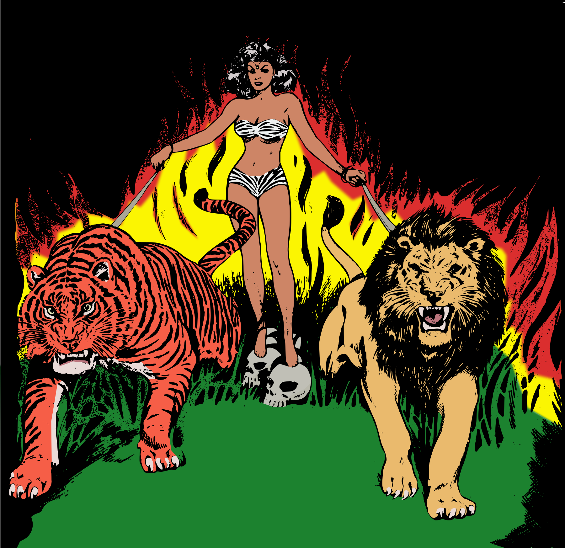 Tags: bikini, comic, fantasy, fire, girl, jungle, lady, lion, pinup, pulp, queen, skull, swimsuit, tiger, woman, queen jungle