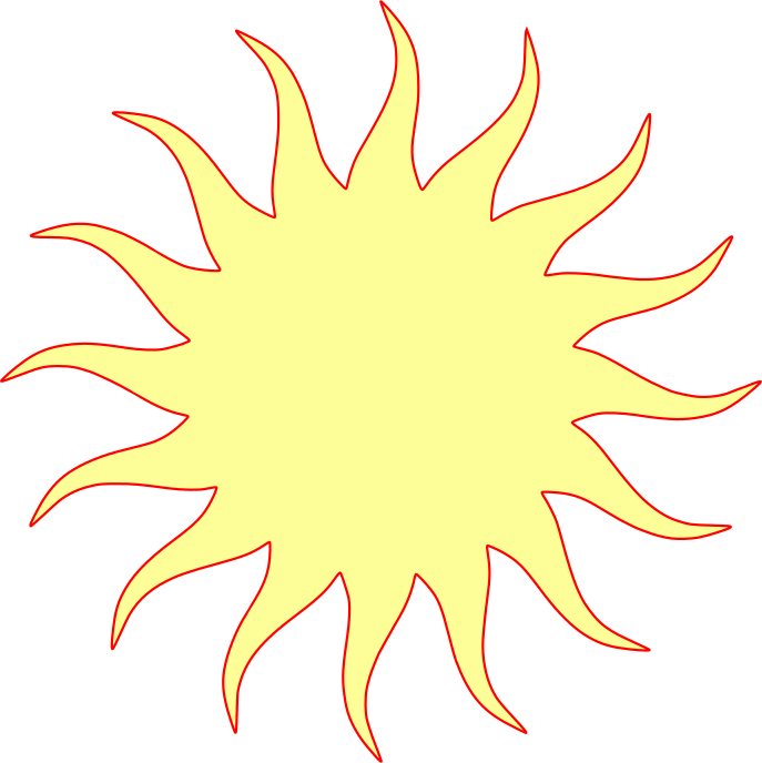 This features a large, bright yellow sun with orange and red hues. It is positioned in the center of the frame, taking up most of the space. The sun's rays extend outwards from its center, creating an illusion of depth and dimension. This vibrant and colorful representation of the sun creates a striking visual impact on the viewer.