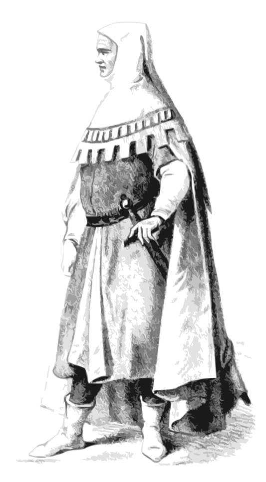 This features a person dressed in medieval clothing, wearing a long robe and a hood. They are standing with their hands on their sides, possibly posing for the picture. The outfit appears to be a combination of a nun's garb and a knight's armor, giving it an interesting and unique appearance. The person is positioned in the center of the image, drawing attention to their attire and overall presence.