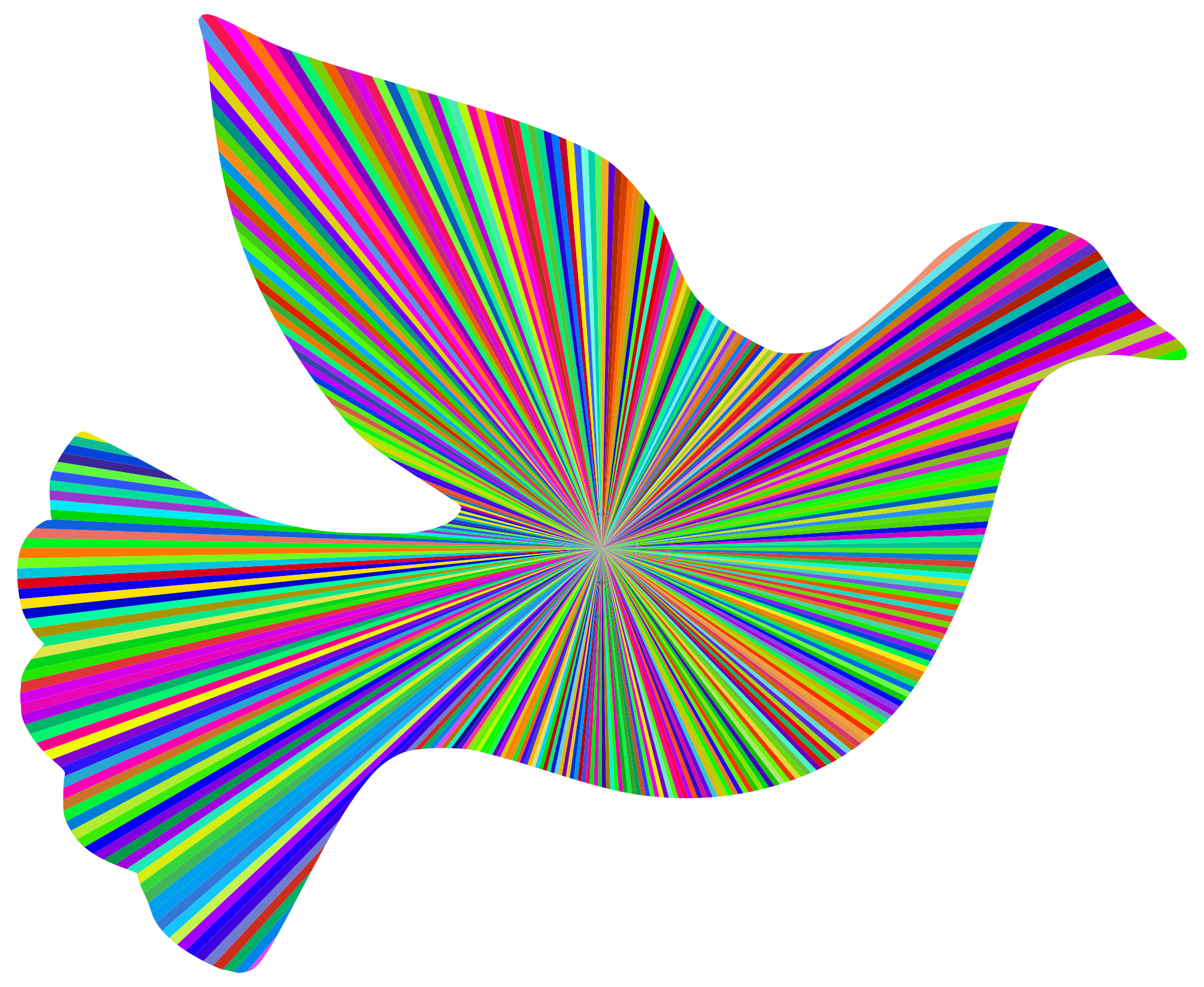 This features a colorful dove with rainbow colors, including pink, blue, green, yellow, and orange. The dove is spreading its wings wide, creating an eye-catching visual effect. The vibrant colors of the dove make it stand out against the white background, giving the impression that it's flying through the air. This artistic representation of a peace dove adds a sense of tranquility and harmony to the scene.