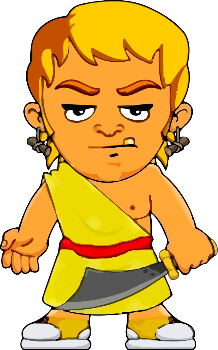 This features a cartoon character with an angry expression on its face. It is wearing a yellow and red toga, which gives it a Roman-like appearance. The character has a toothpick in its mouth, adding to the playful nature of the scene. Its facial expression suggests that it might be reacting to something or expressing dissatisfaction. Overall, this cartoon figure exudes a sense of humor and fun with its unique attire and quirky accessory.