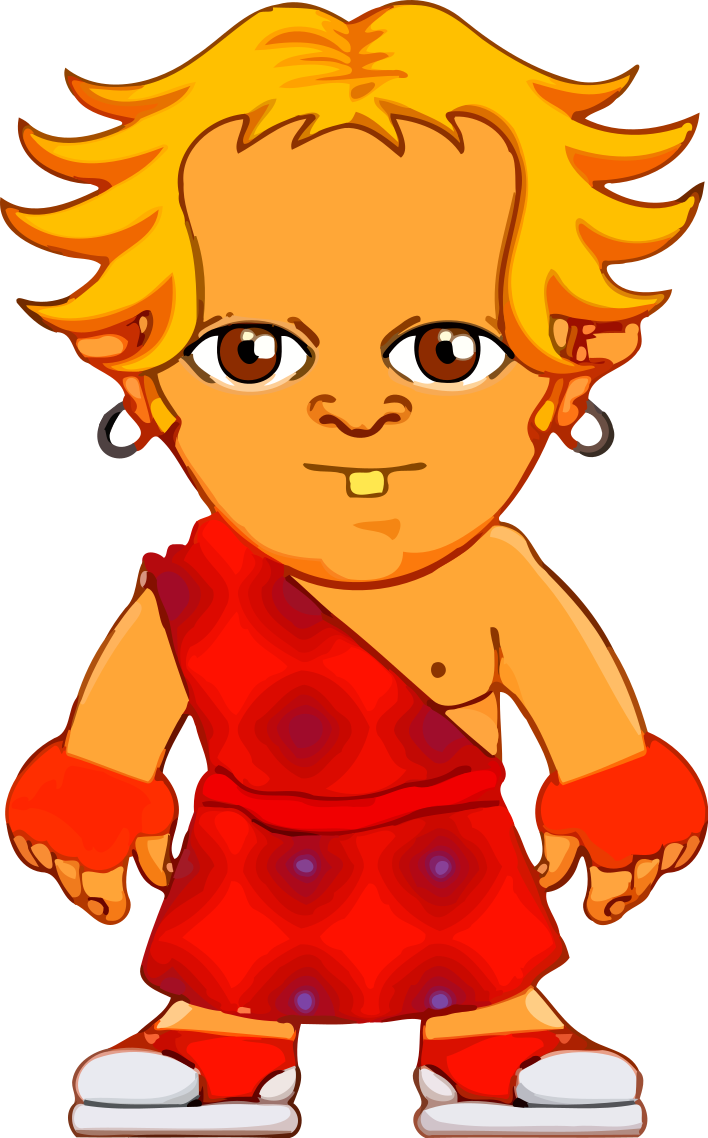 This features a cartoon character with an orange and red color scheme, wearing a red dress. This character has a unique appearance, as it is described as having "dreadlocks" or "spiky hair." It appears to be a young person, possibly a child, with a playful expression on its face. The cartoon figure seems to be posing for the camera, showcasing its vibrant and lively design.