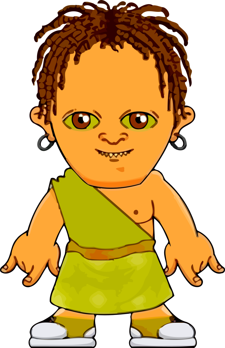This features a cartoon character with dreadlocks, wearing a green and yellow outfit. This unique figure appears to be a young boy or a child, possibly from an ancient civilization. He is standing in the center of the frame, posing for the camera. The character's attire includes a skirt, which adds to his distinctive appearance. Overall, this cartoon depiction creates a lively and engaging visual experience.