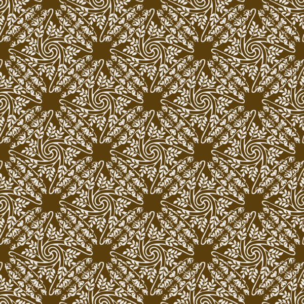 This features a brown and white patterned fabric with an intricate design. The pattern consists of various shapes, including circles and swirls, which are interconnected to create a visually appealing texture. These patterns are arranged in a way that fills the entire frame, creating a cohesive and harmonious appearance. The combination of brown and white colors adds depth and contrast to the design, making it an attractive choice for various applications such as clothing or home decor.