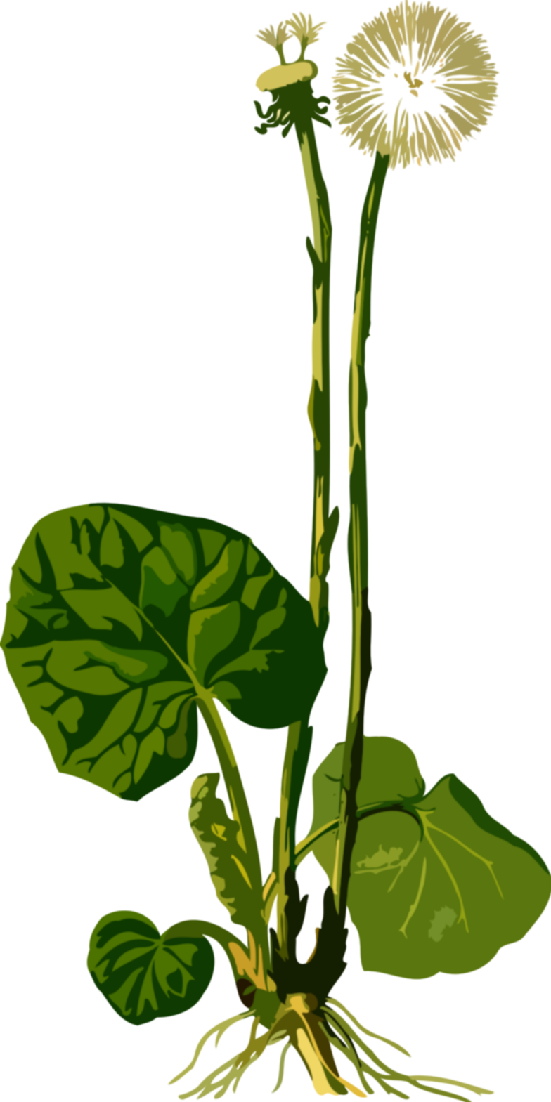 This features a close-up of a plant with a large green leaf and a small flower. The plant is situated in the center of the frame, taking up most of the space. Above the plant, there are two dandelions, one on the left side and another on the right side. These flowers add to the overall beauty of the scene. The image appears to be a drawing or painting, showcasing the intricate details of the plant and its surroundings.
