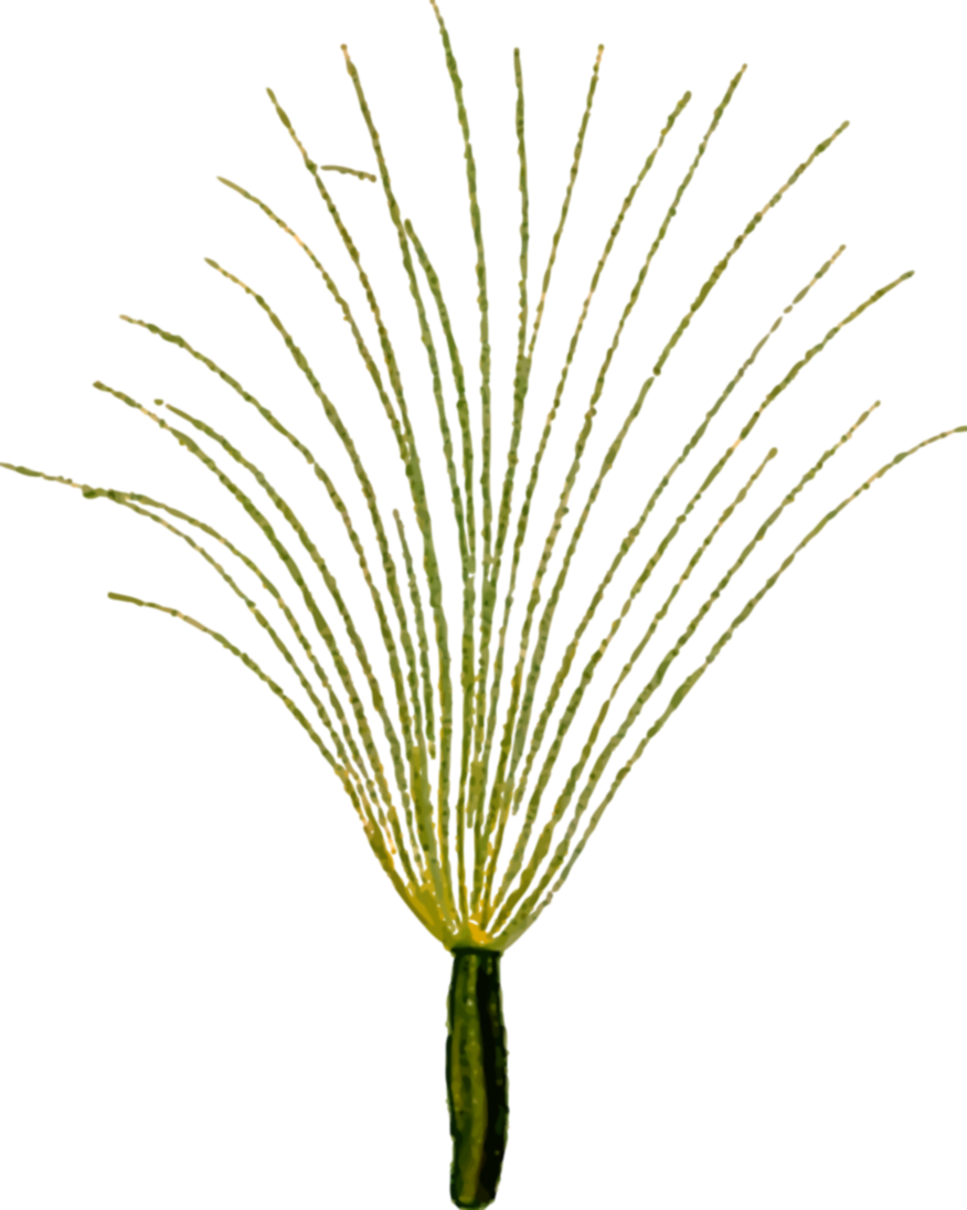 This features a close-up of a plant with long, thin stems. These stems are green and have a slightly curved shape. They appear to be growing out of the top of a cactus or a similar plant. The stems seem to be in a bundle, creating an interesting visual effect. The overall appearance of the image is quite unique and captivating due to the combination of the long stems and the cactus-like growth.