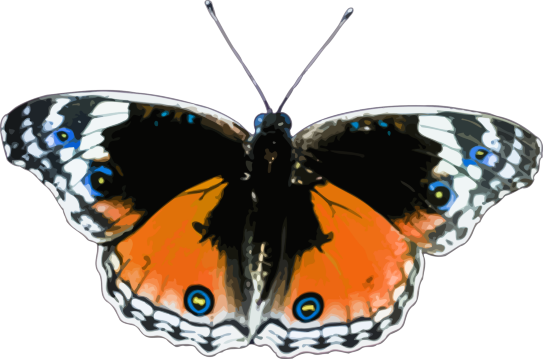 This features a large, colorful butterfly with an orange and black wing pattern. It is perched on top of a white background, drawing attention to its vibrant colors. The butterfly has blue eyes, adding a touch of realism to the image. Its wings are spread out, showcasing the intricate patterns that make up its unique design. Overall, this captivating image highlights the beauty and elegance of nature's creations.