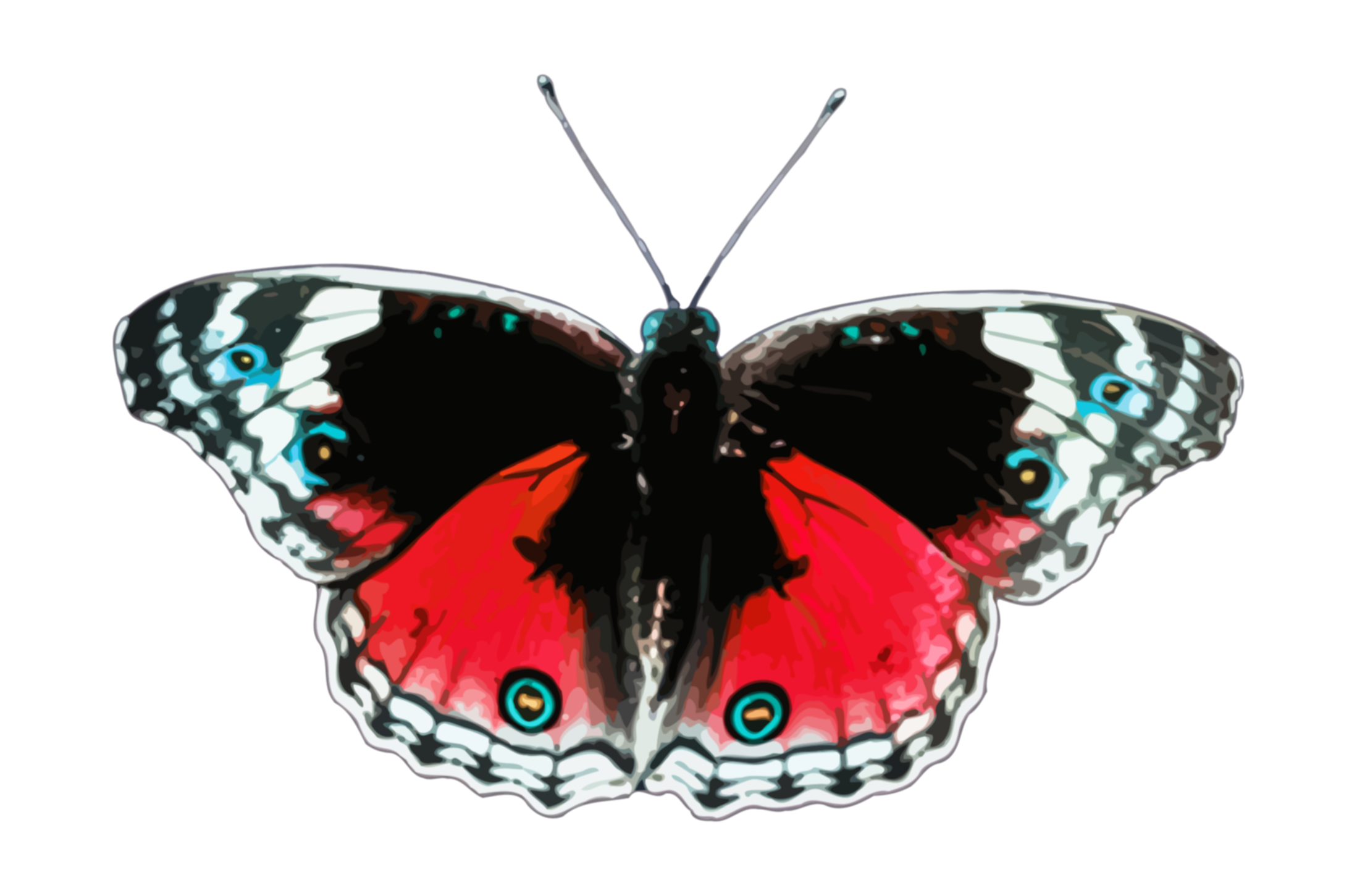 This features a large, colorful butterfly with red wings and blue spots. It is perched on top of a white background, drawing attention to its vibrant colors. The butterfly's wings are spread out, showcasing the intricate patterns and details that make it stand out as an eye-catching subject. Its position in the image suggests that it may be captured in flight or resting momentarily on a surface. Overall, this striking image captures the beauty of nature with its vivid colors and detailed design.