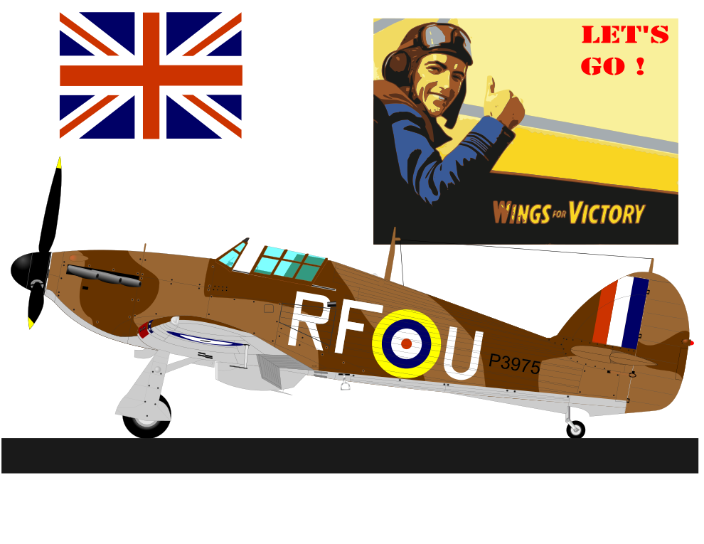 This features a British fighter plane with the words "Wings of Victory" written on it. The airplane is parked on a runway, and there are two people standing nearby. One person appears to be pointing at the plane while the other looks up into the sky. The scene also includes a flag in the background, adding to the patriotic atmosphere.