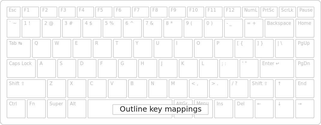 This displays a computer keyboard with the words "Outline KeyMappings" written on it. The keyboard is white and has multiple keys, including letters such as A, S, D, F, J, K, L, M, N, O, P, Q, R, and Z. Additionally, there are function keys like Ctrl, Alt, and Shift present on the keyboard. The layout of the keys is typical for a standard computer keyboard, making it easy to use for various tasks such as typing documents or playing games.