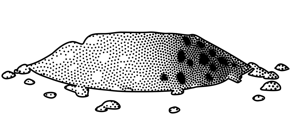 This features a black and white drawing of an open umbrella, with the top part of it being cut off. The umbrella is placed on a rocky surface, giving the impression that it has been left behind or abandoned. There are several rocks scattered around the umbrella, some closer to the foreground while others are further away in the background. The overall scene gives an impression of a deserted or abandoned location with the open umbrella as its focal point.